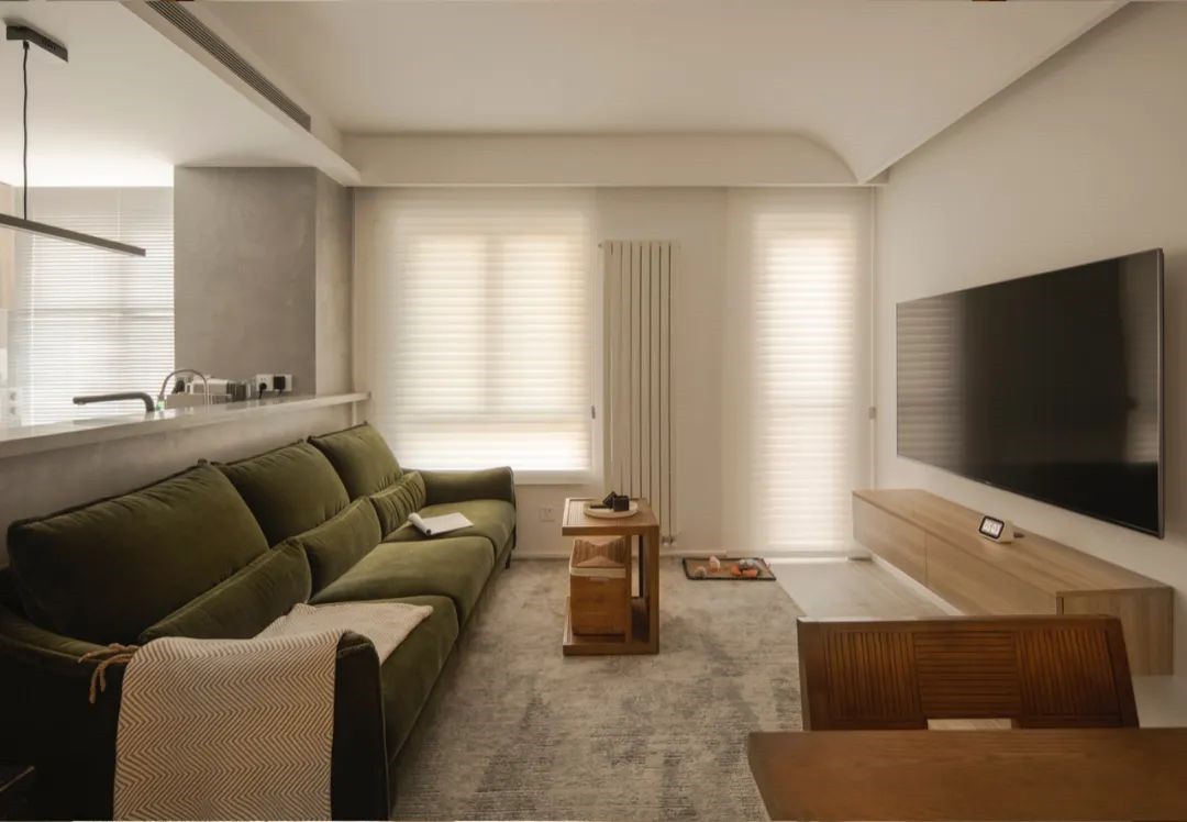 客厅区设计清新素雅,主墙壁悬挂70寸电视,方便居家时娱乐休息。布艺沙发选用莫兰迪绿,如绵密的森林,又如色块的徜徉、倾泻,梦和自由常定格在此。餐桌上待饮的佳酿,可隐约见二三友人,促膝而谈,静享恬然之乐。清闲时,也是独处和办公的理想场所。