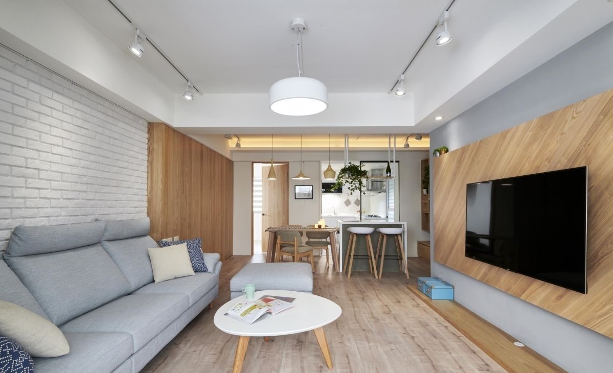 客厅白色墙面与木质材料搭配,吊顶添加轨道灯,简单又有个性。