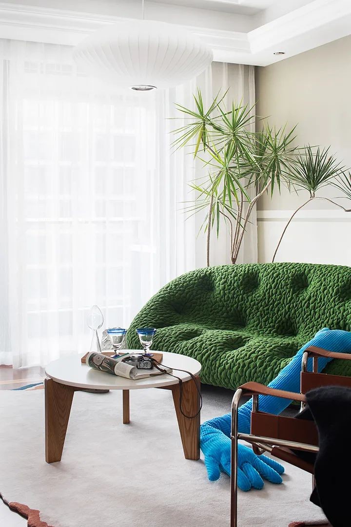 空间绿色沙发让整个客厅产生视觉焦点,红地板与绿色沙发不动声色地撞色,各尽其美。所以,世上并无永恒相克的颜色,只取决于如何搭配。