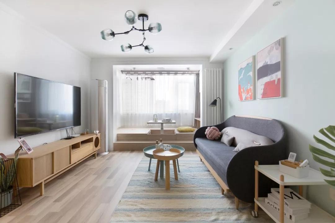客厅选择了马卡龙蓝色的墙面颜色和蓝色系的地毯,搭配吱音品牌的沙发,清新且轻盈。定制地台与客厅形成有效互动。