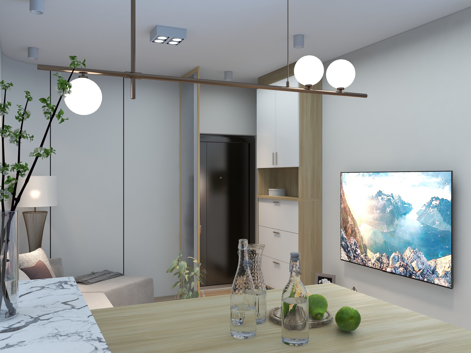 客厅电视背景墙采用冰冷的灰色漆同时与旁边原木色鞋柜相互融合,让冰冷的墙漆有着一股温暖的暖火