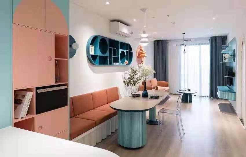 紧凑的学区房,户型相对比较小。我们把厨房和餐厅连在一起,让整体更开阔。