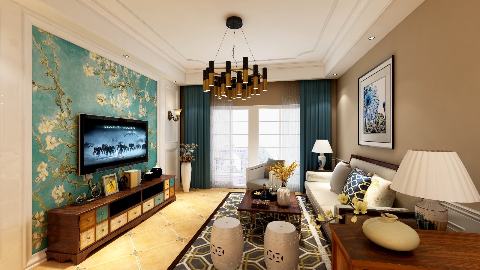 背景色为温馨的卡其色,让家充满温馨的感觉,主背景用孔雀蓝与白色的经典搭配,让人眼前一亮。