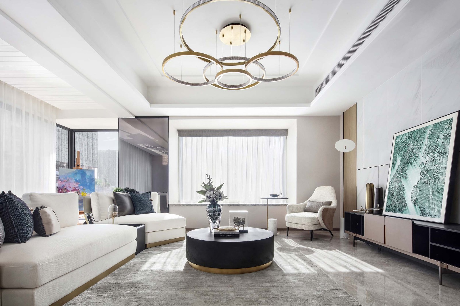 大理石面的电视背景墙,布置上现代舒适的布艺沙发,黑色金边的圆形茶几突出视觉中心,主灯不管是从形状还是材质上的选择,都与其相呼应。 大面积落地窗为空间带来明亮舒适的采光,现代风的基调布置下,摆上简约的家居,让空间显得从容而舒适。 窗户采用白色纱窗作为日常遮光,***保留了光线进入的同时,也确保了室内的私密性,想象当阳光洒进来,空间充满了轻松自然的惬意感,意在呈现一种雅致、安静的生活方式。