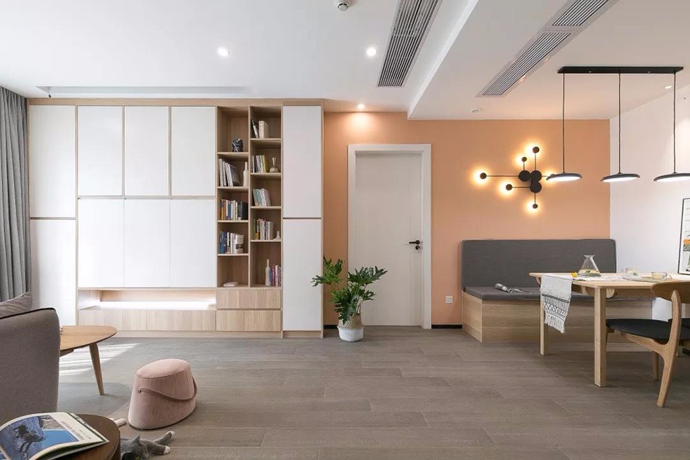 一堵嫩橙色的沙发背景墙兀自打破素净的空间。