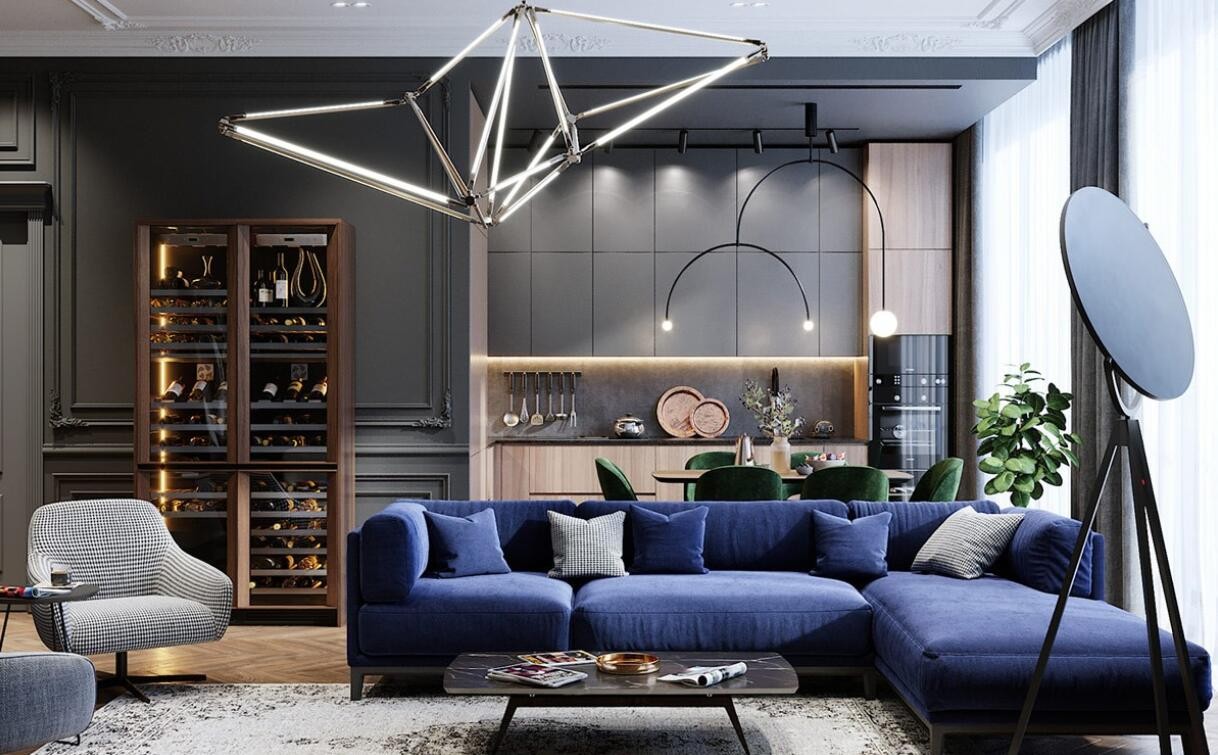房子内部空间的装饰犹如在灰色的画布上装点着钴色和翡翠色的颜料。空间中洋溢着的精致和浪漫。灰色的造型墙面带着理性的光辉,而人字铺的原木地板给空间带来了。