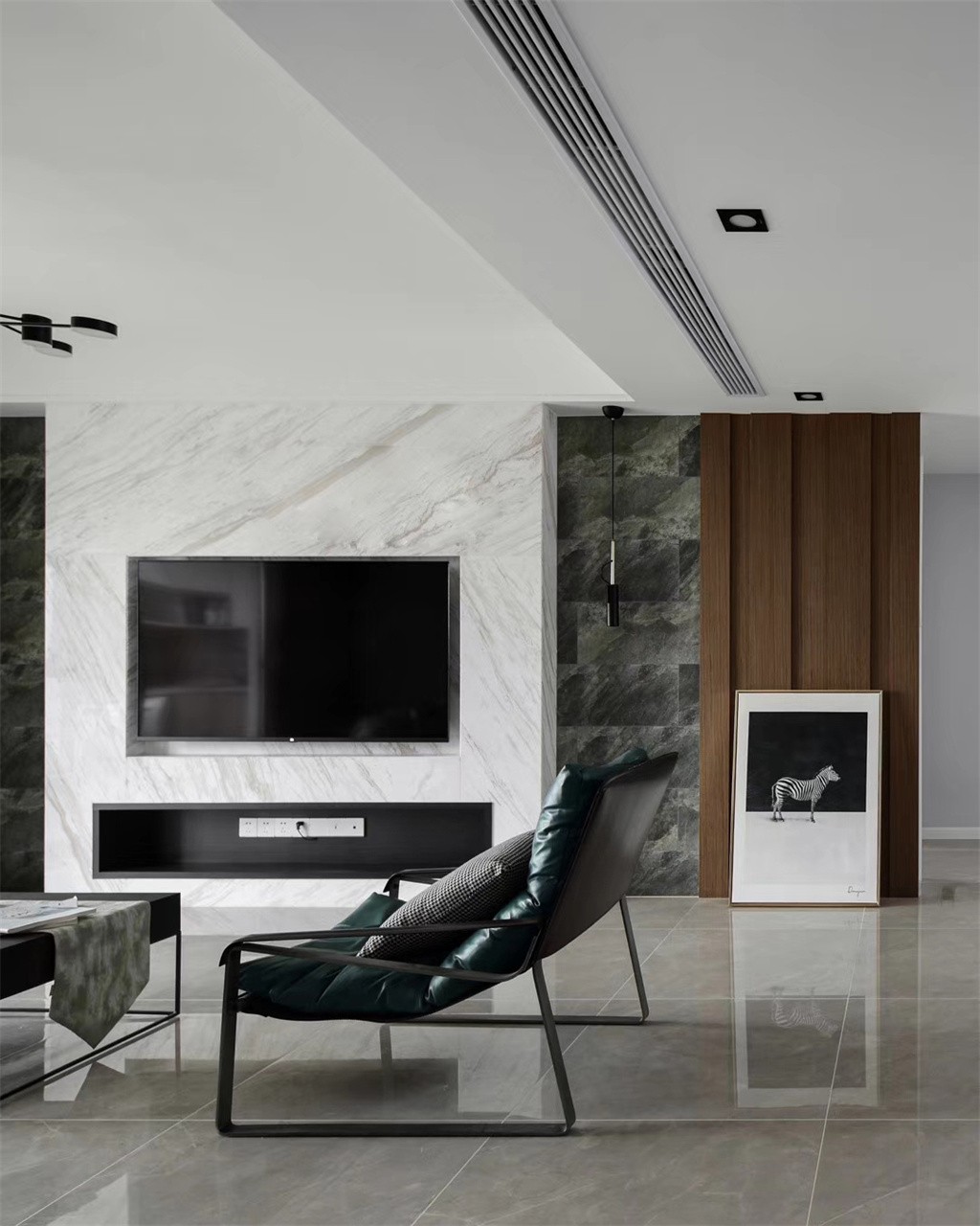 大理石材质与木饰面的结合,现代的质感,浅灰色的布艺沙发,落地灯点亮了整个空间的氛围。