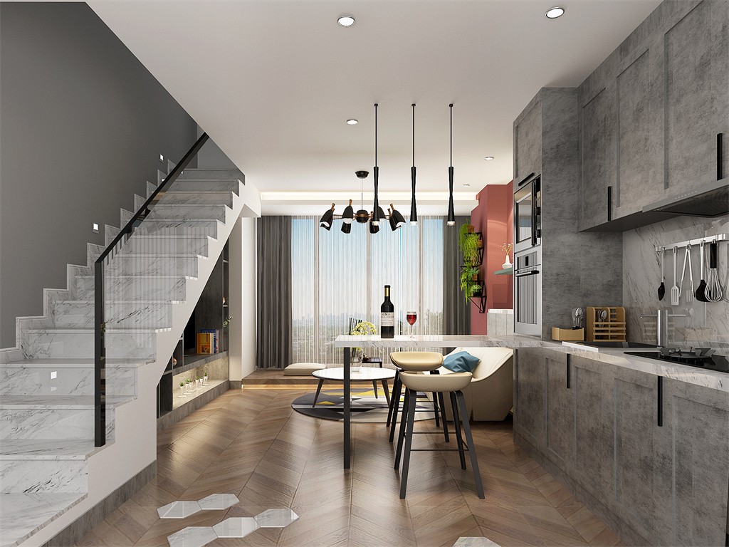 橱柜为灰色岩板与不规则的墙砖搭配,充满了小资情调,沙发背景红色时尚大胆,地台做了灯带点亮了整个空间的氛围。吧台与高柜链接在一起,可以一边蒸烤一边品酒,足以招待好朋友。