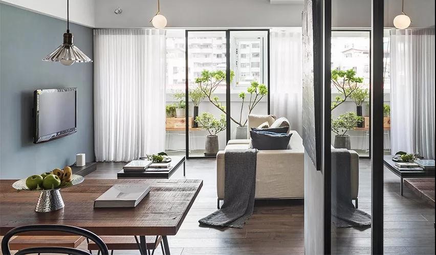客厅以落地窗玻璃与小阳台隔开,阳台是主人的小花园,养着不名贵却清新喜爱的花草,闲暇之余,与花共舞。隔着落地窗,阳台的清新与绿意透过玻璃,坐在客餐厅里也能感受的到。