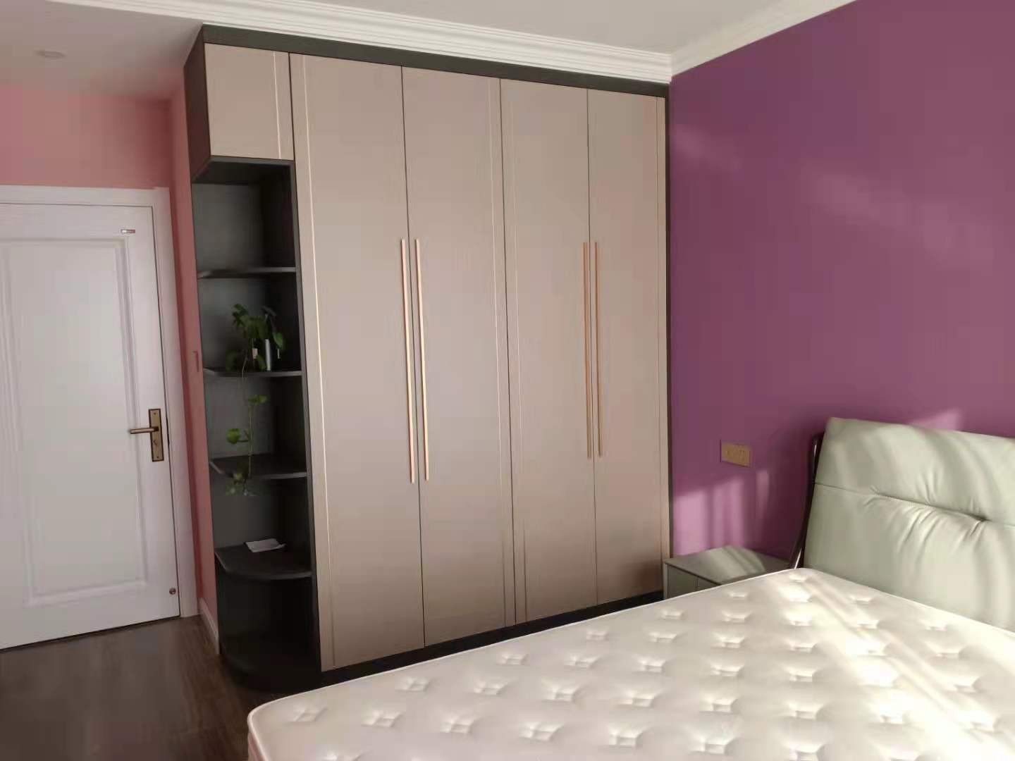 温馨的浅粉色墙面,和高贵唯美的紫色背景,显的主卧很有温暖家的感觉