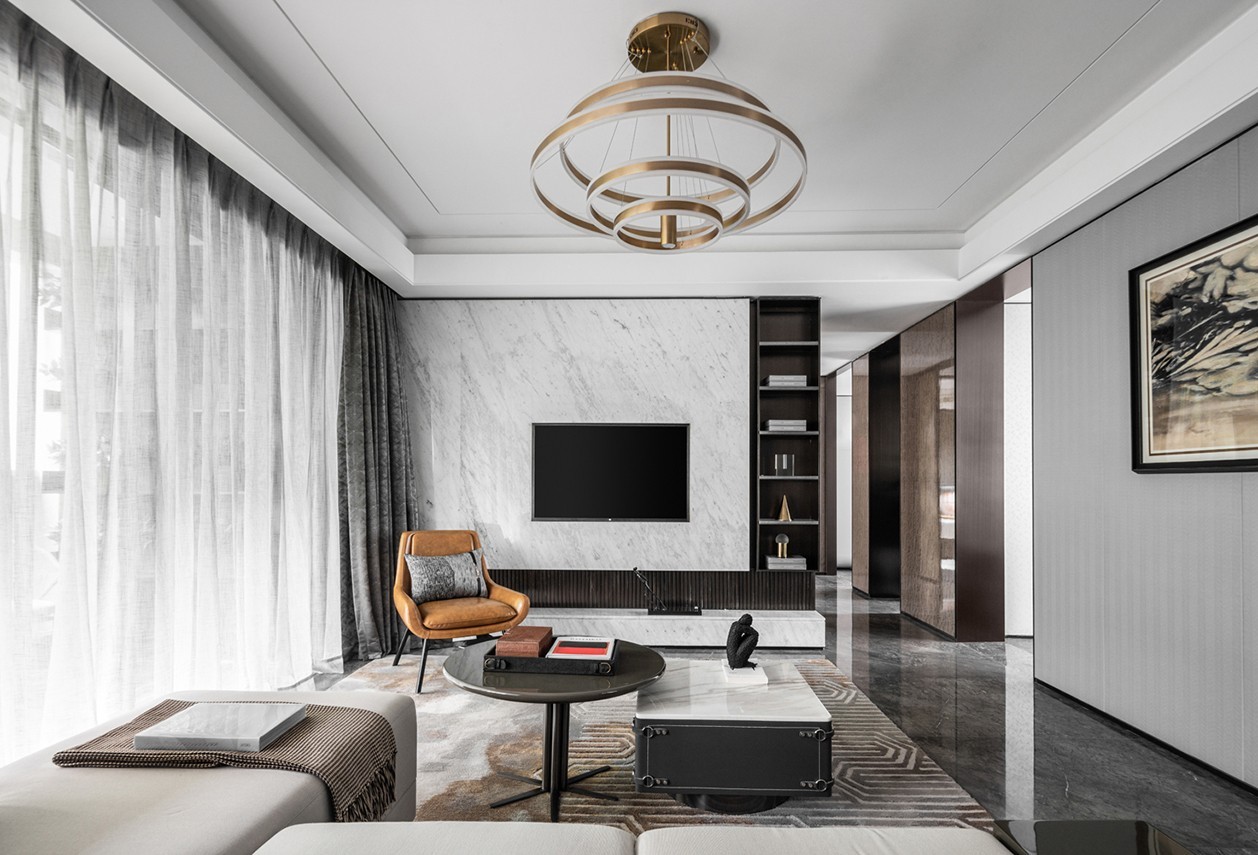整个空间以干净利落的线条和造型的陈设,拉开空间层次,暖色调的配色点缀,增加设计中沉稳轻奢的元素,稳重、大气、却又不失品位,有令人眼前一亮的感觉。