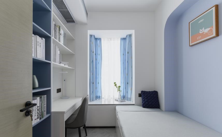 女儿喜欢蓝色,白色主调搭配浅蓝色的墙面,蓝色的窗帘与浅蓝色书柜面板,看着清新柔和
