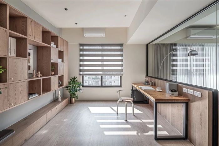 家中两人很喜欢看书,书房设计很注重功能性而非装饰性。长型书桌对于看书、工作都足够用,留住原生自然,又享有独处静谧。夫妻时而各自忙碌,时而聊天作伴的交流互动。
