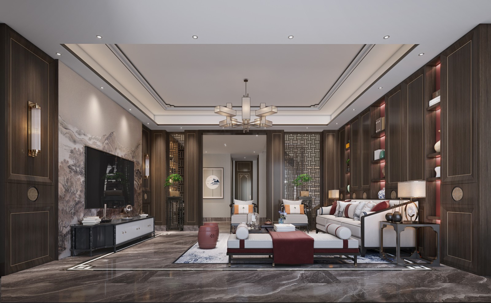 客厅的主色调汲取了有温度的原木色,清雅的色调与现代简约形制融构于一体,在空间中铺陈出别有风致的现代中式美学意涵。走入空间,可见水纹的柔美点染于软包、画饰、地毯等软装上,渲染出怡人舒适的空间氛围。回字纹的艺术隔墙,将四时风光纳入框景中,邀人坐看自然的生机、时间的足痕。