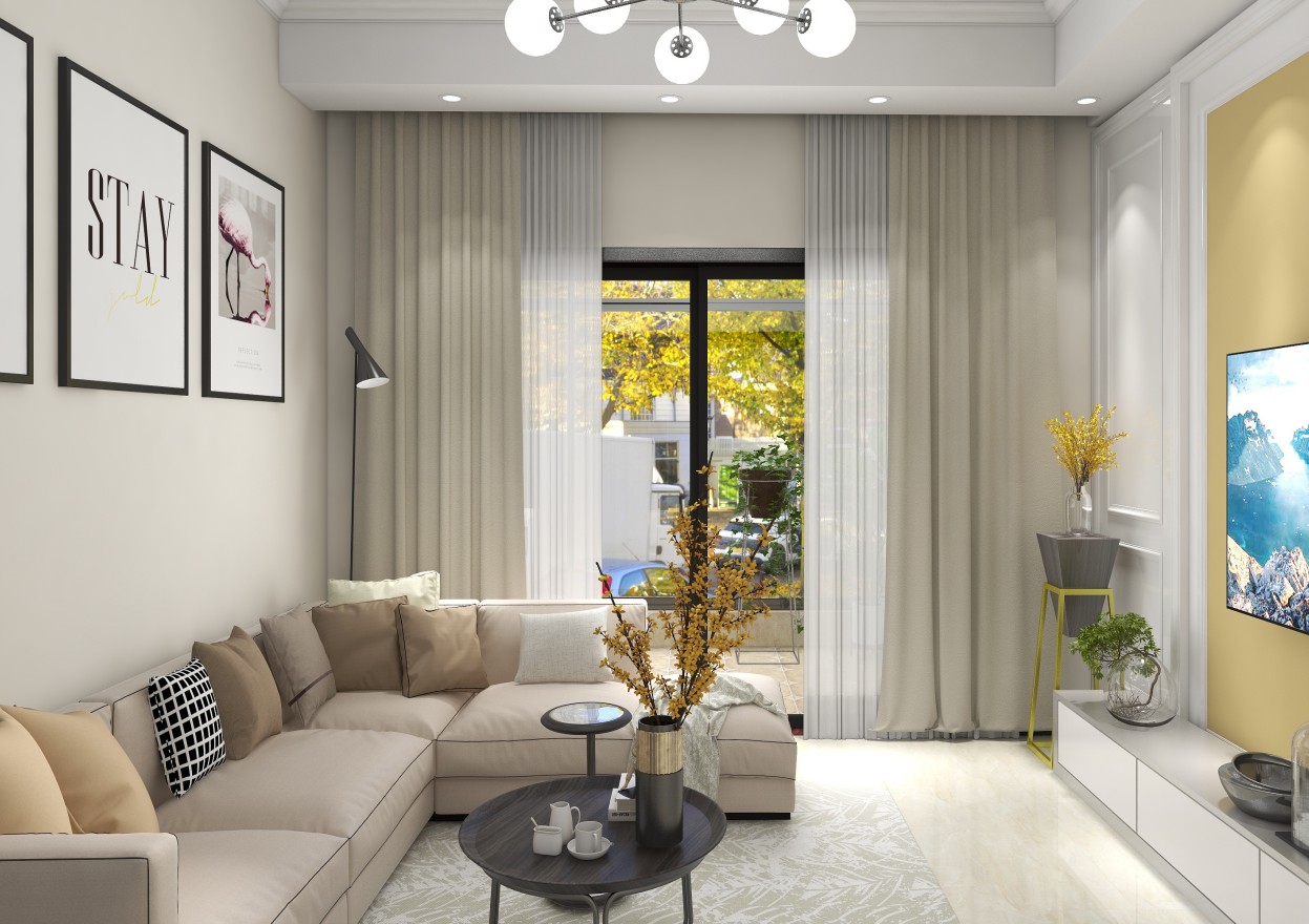 客厅的吊顶结合了业主的要求所设计的,与空间完美的结合在一起。