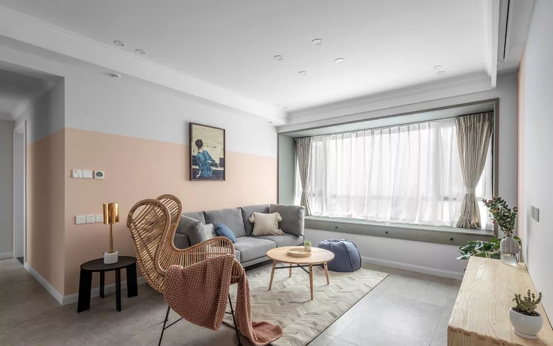 利用飘窗做成一个整体的抹茶绿储物休闲空间。他说最喜欢的就是靠在上面看风景,1.8m高的橘黄色墙面,是这双璧人对彼此的包容和迁就,是对于这个新家的美好愿景。
