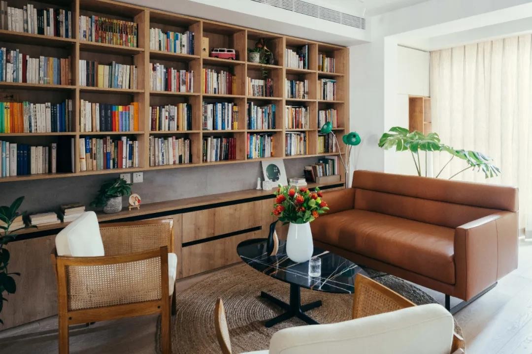 客厅布置打破常规,不以电视为中心,更加注重对话交流。大面积书柜满足主人藏书所需,也让整个空间充满了书香气。中古藤编单椅与焦糖色皮沙发,其复古的质感,有岁月流淌的痕迹。