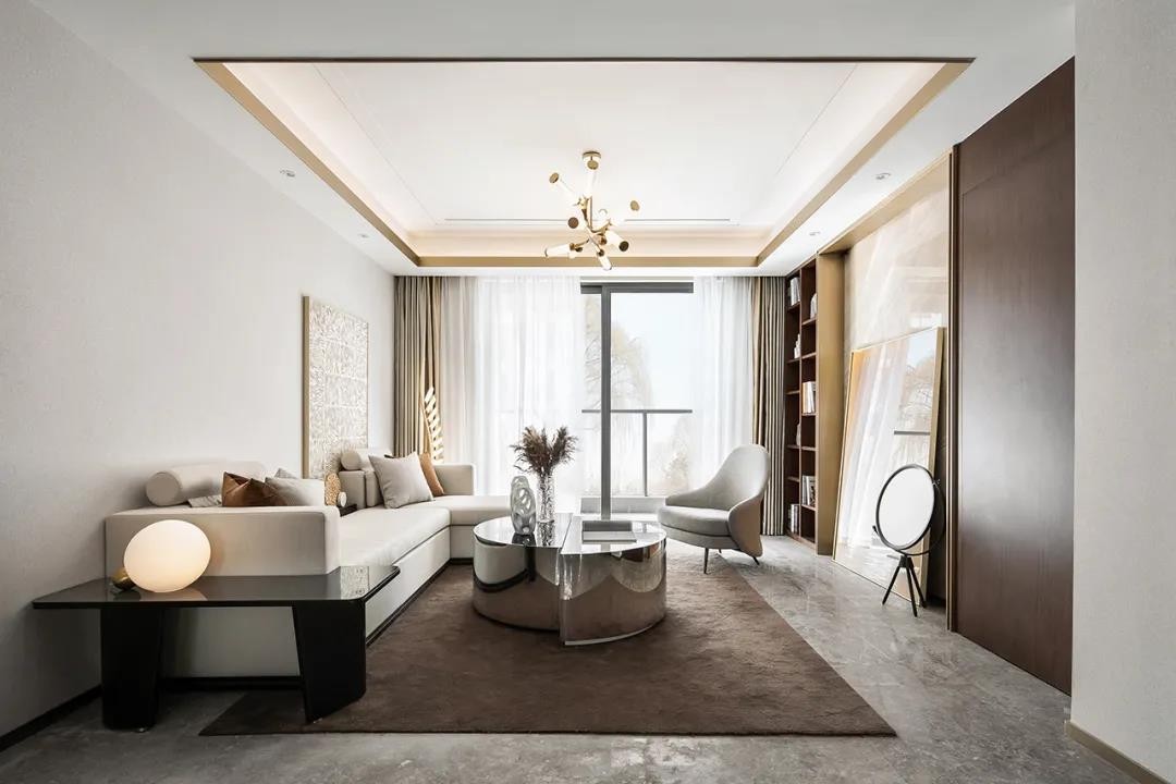 家具采用的大转角布艺沙发点缀金属细节 舒适中带点精致的小情调生活感油然而生 茶几采用的是水的元素 上面的枯山石仿若石头掉入水中 泛起层层涟漪的水纹画 在扇形的灯光下显得格外温暖而灵动