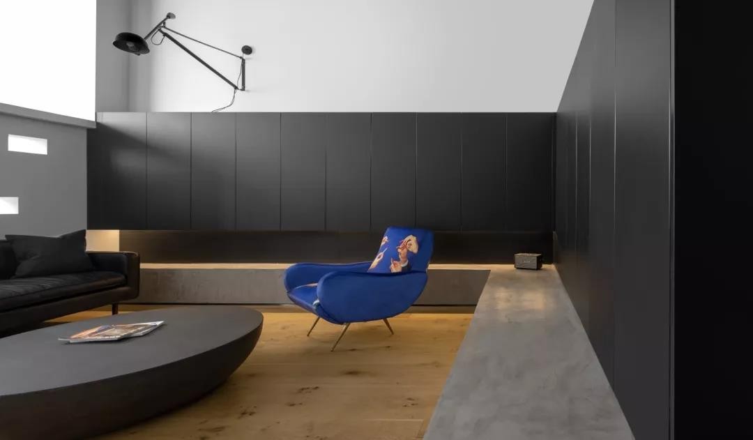 客厅整体是屋主最爱的“黑白分明”色系,黑色部分带有围合感,上方白墙开阔不压抑,地面选择木地板多了点儿温润感。墙面装了可调节的悬臂灯,可以给大部分座区提供点照明。