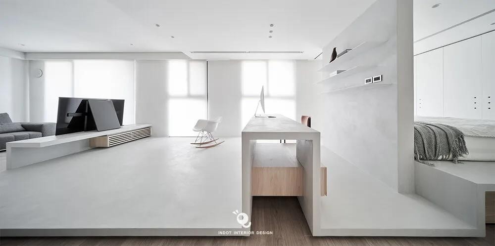 进入客厅开始就可以看到刻意抬高的地面和走道区域,干净简洁的配色,东西都放在大容量的收纳柜中,让整个空间可以随意地坐躺。