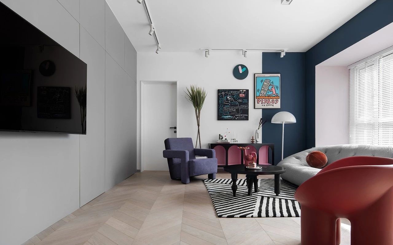 在色彩搭配上,选用让人比较沉静、有助于睡眠的深蓝,作为卧室的主基调,再配以安宁温暖的橡皮粉作为辅色,同时白色柜体减少了空间的拥堵感,让空间色调也更为的明快。