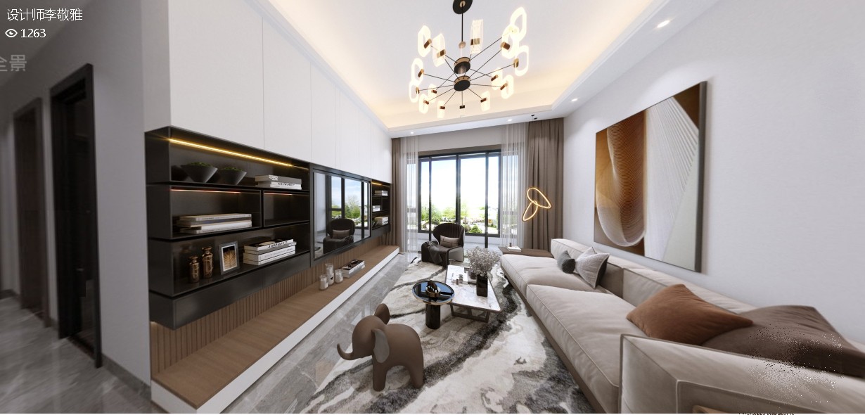 客厅——客户喜欢深色调,但空间小,设计效果的时候满足客户的需求,客厅电视柜上半部分用浅色使空间敞亮不压抑