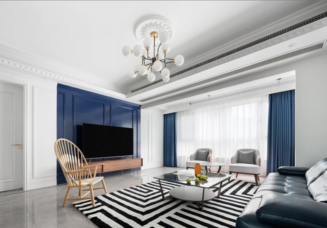 优雅清爽的线条,深蓝色的电视背景墙和窗帘,让整个空间深邃起来。蓝色是博大的色彩,搭配白色的球状主灯,又增加了干净生动的氛围。