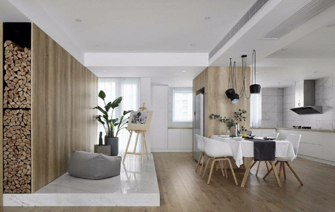 白色搭配上原木色,使客厅显得很有格调,壁炉里的木头摆放增加艺术的美感。