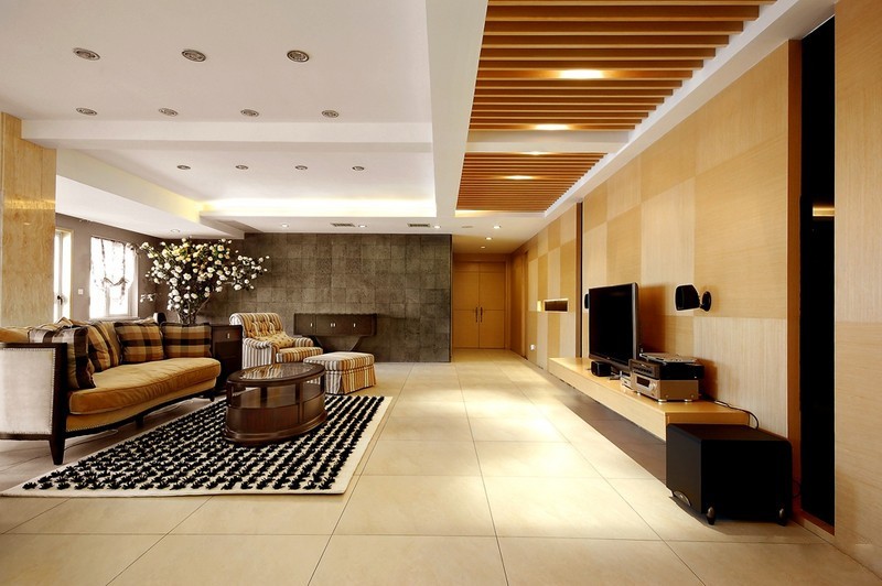 为了让巨大的空间现代现代不那么空旷将顶部过道设置造型吊顶,使客厅与过道呈现交错感