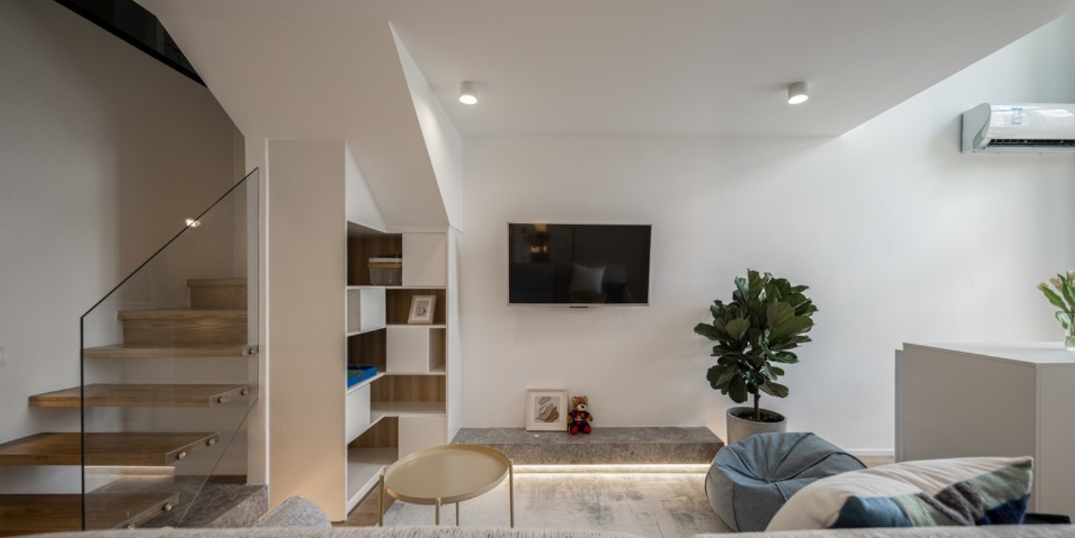 楼梯采用悬空的木质阶梯,充满科技感,每级悬空的阶梯都是打进墙体里面,美观的同时保证安全也是设计师考虑的要点,但是相对于一般常规的楼梯,悬空部分确实加大了施工的难度,工期也因此延长了时间,很感谢屋主小姐姐的支持与理解,大概美好的事物总是值得等待,出来的效果也是很不错的~ 素色的沙发搭配浅黄的茶几,低饱和色彩带来的简约不失温暖。电视上墙,提前将所有线管预埋好,呈现出来的***净利落的电视墙。