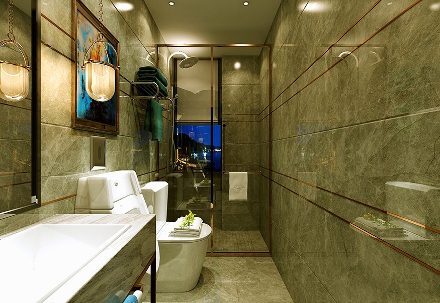 主卫墙面选择了800*800通体砖一开二,利用玫瑰金不锈钢一个搭配,这样出来的效果比较简约时尚。