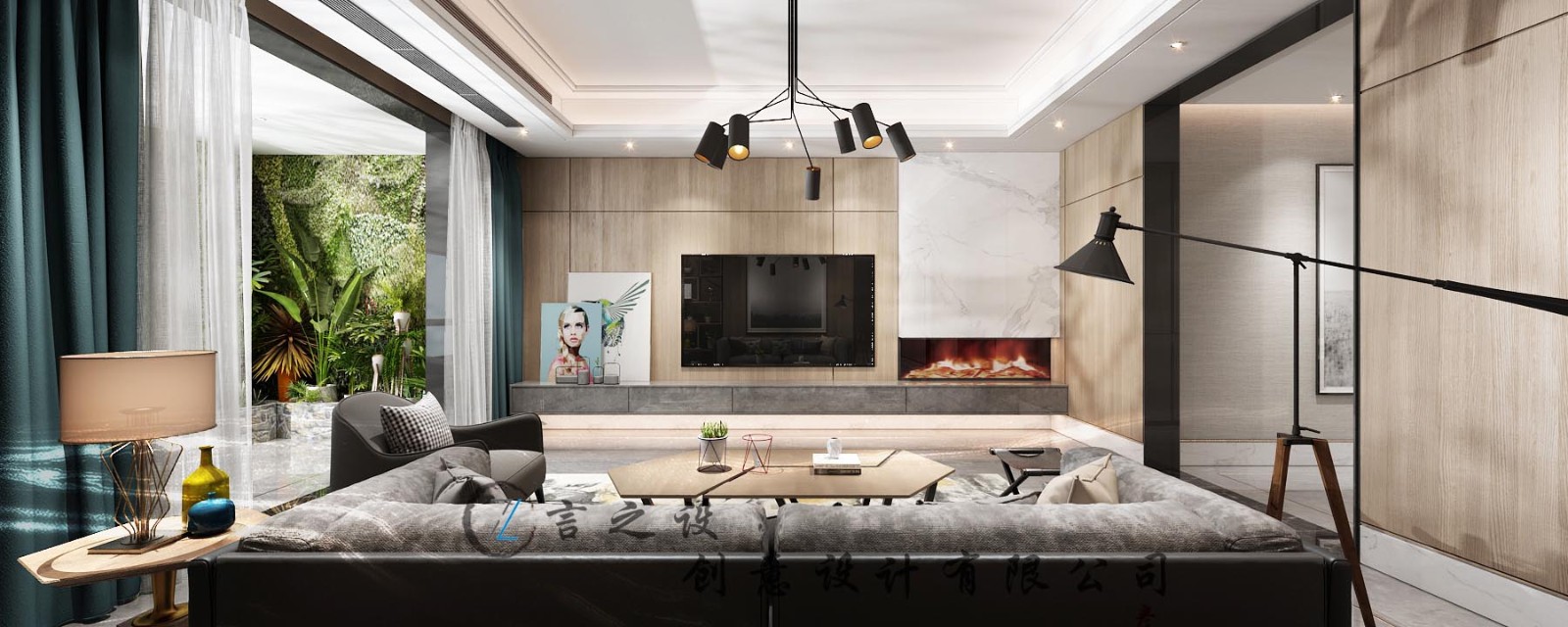 电视背景墙设计,将壁炉放在电视左侧,上方用一块白色石材区分,电视左侧采用艺术画装饰整体采用三角构图的形式,让空间更加具有设计感。