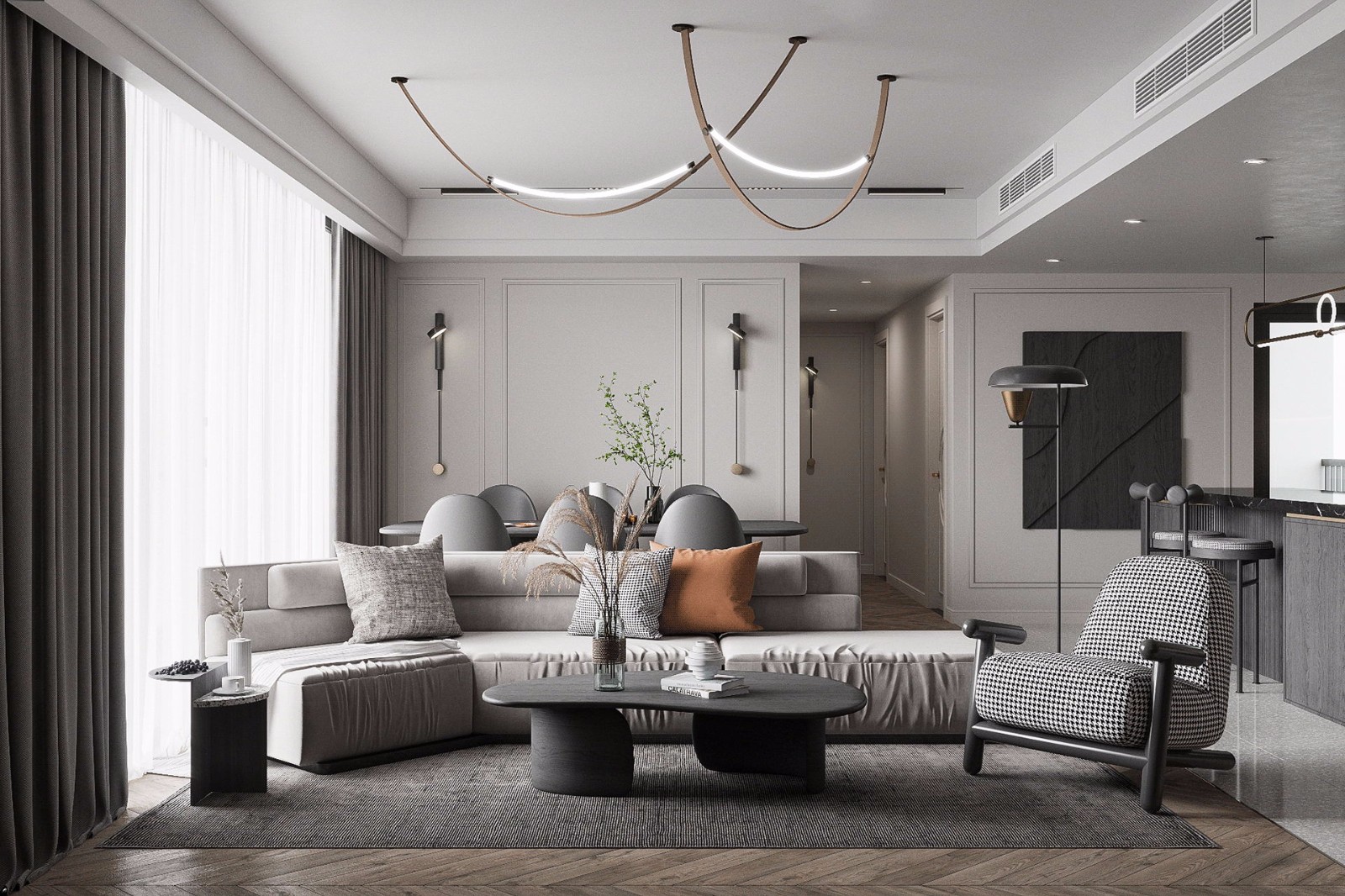 现代简约客厅采用大自然实木地板人字拼接施工工艺。墙面采用竹木纤维集成墙板。