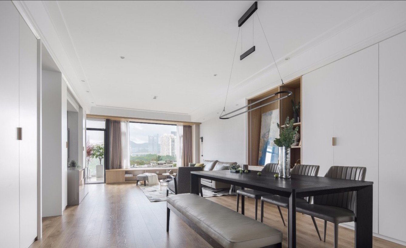 大场景拥有丰富的小细节:天花吊顶切斜边,引导向上。柜子框架切斜边,增加精致度。电视柜藏着投影幕布位置