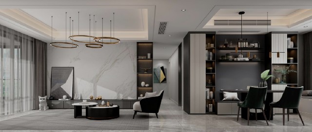 灰白金色搭配木质,优雅尽显。客厅、餐厅,阳光通透,健康居家。