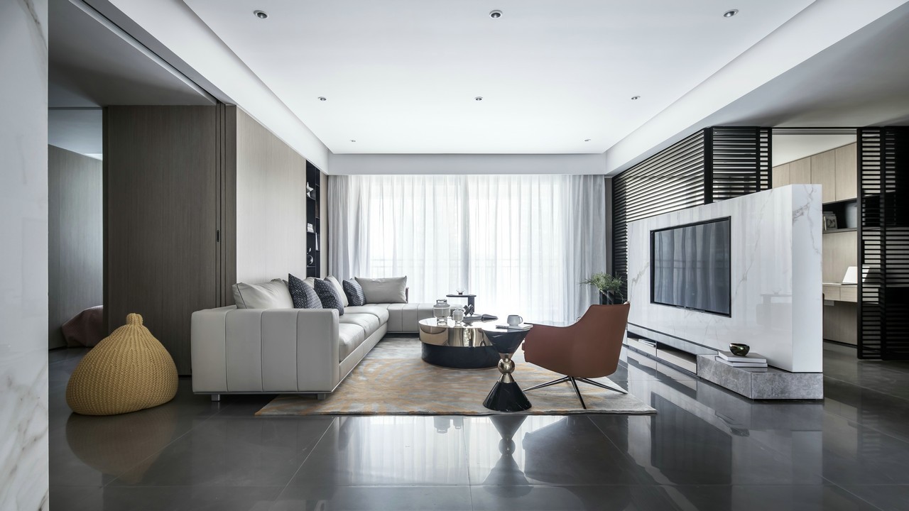 空间整体用极简的设计手法,开放的布局,造型干净利落的顶面与墙面,体现出现代简约生活的品质感。
