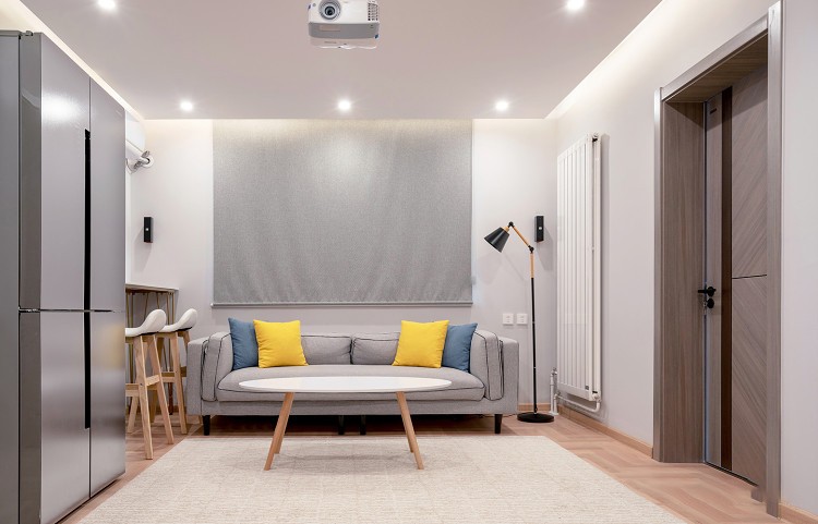 正面看幕布区域,墙面的幕布是固定在墙面上,没有暗藏在吊顶内部。电视柜选择的是可拉伸式,能根据需求进行伸缩。电视柜的抽屉,可以放一些客厅杂物,中间的开放格可以放机顶盒等设备。