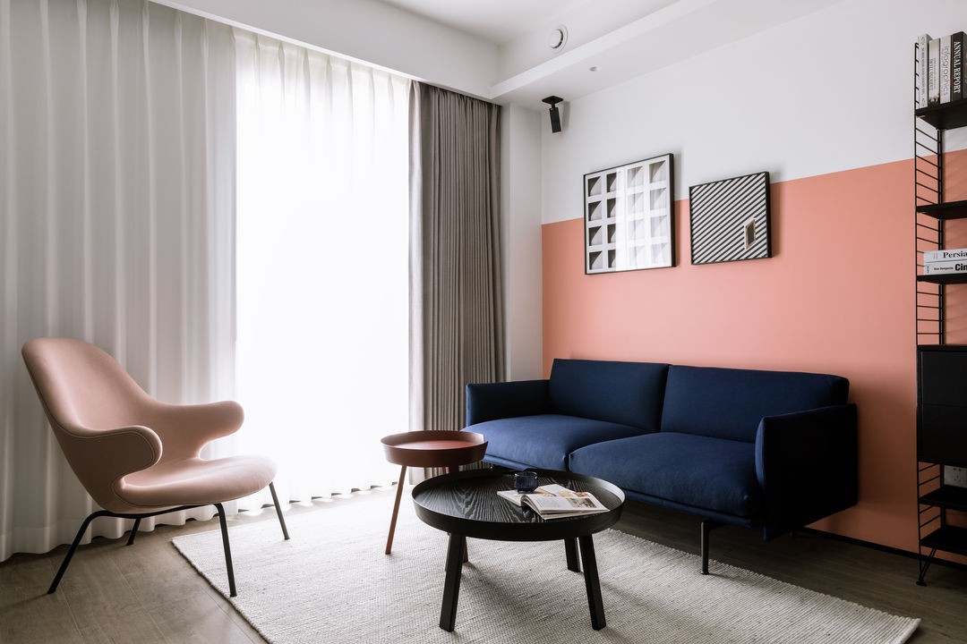 粉色背景墙搭配藏蓝色沙发,活力与稳重的结合,让客厅不单调沉闷。沙发一侧,打造成办公区域,黑色组合书桌,简易实用