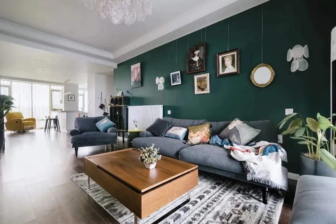 因为屋主喜欢绿色调的搭配,于是客厅采用蓝灰色的沙发搭配墨绿色背景墙,时尚中带有一点复古气息。墙面用几幅复古画装饰,一股美式的精