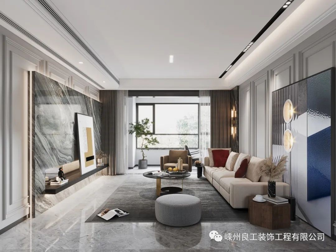 样板间空间很大一部分的魅力来自于它兼容并蓄的巧妙搭配,大理石背景与浅色护墙板造型,结合具有个性化的艺术饰品、灯具以及家具等软装延续空间的魅力。