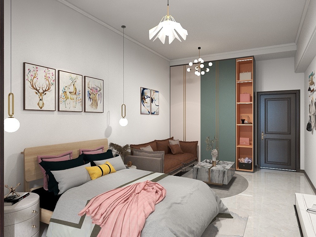 卧室和客厅一体更适合现代年轻人居住,入户做了衣柜和鞋柜一体的柜子。