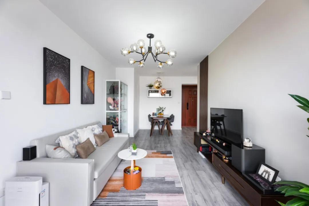 采取客餐厅一体的设计,不仅可以避免空间的拥堵感,还能保证餐厅区域的自然光线。沙发旁边接近餐厅的位置摆放了一个透明柜,里面摆放的是业主喜欢的手办,让空间变得有趣又有爱。