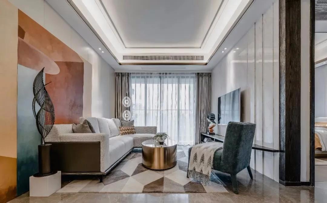 简约温馨的沙发,搭配金色圆茶几,角落还有一个盘状的装饰灯具,整个空间精致细腻的质感,让空间显得更加温馨高端。