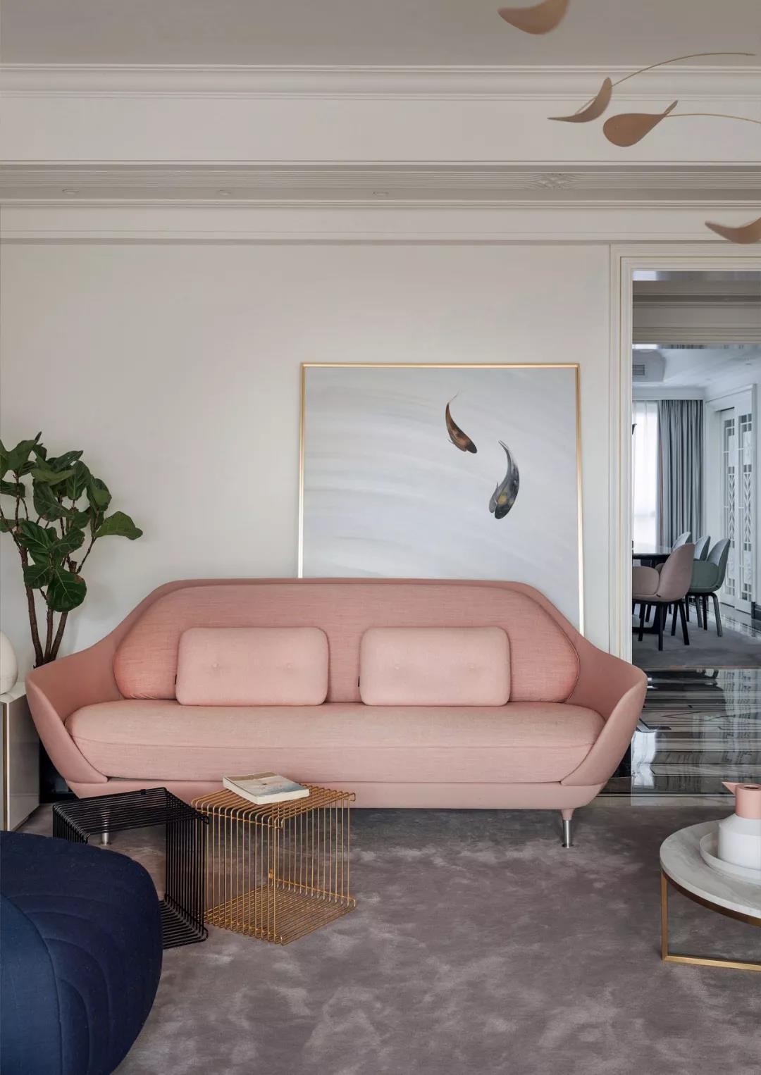 位于房子另一侧的餐厅空间,墙面做了简单的墙画造型,大理石与布艺、金属结合的餐桌椅,给这个餐厅空间带来了时尚感。