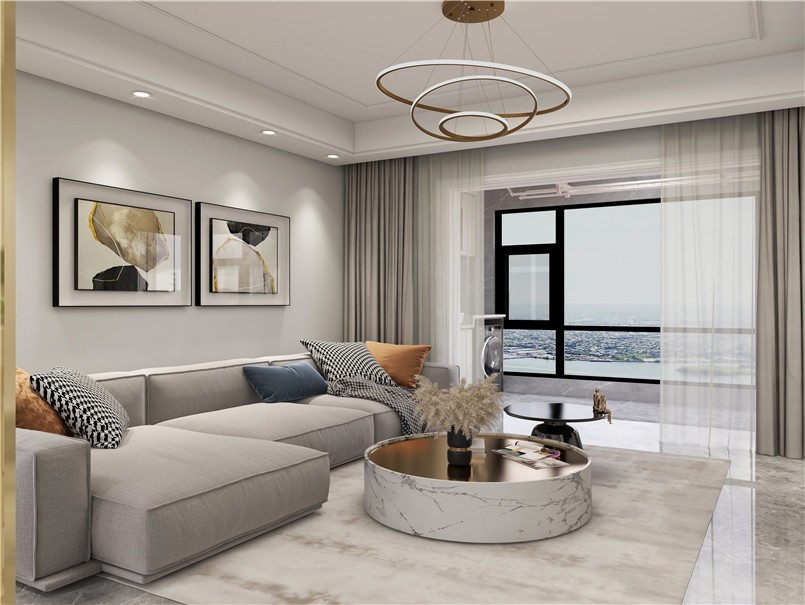 客厅墙面材料为乳胶漆,使用网红色“太空漫步”作为墙面基础色。家具选择纯色系再加入跳色抱枕的点缀等,丰富的色彩搭配,让整个客厅看起来更有层次感。
