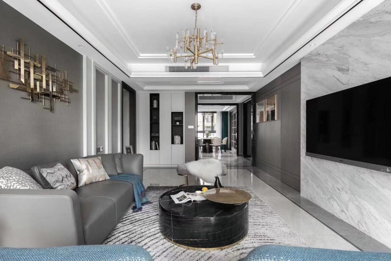 餐厅与客厅空间相通,整体运用了大理石纹理黑白板材搭配,制造空间的纵深感。 餐桌也是黑白配色系,大象灰的皮质椅子看起来就很舒服,餐边柜使用按弹门,黑色不锈钢做装饰格,跟客厅电视柜保持整体性。 让整个层高更加挺拔。月光灰地面与翡翠绿的组合,仿佛银月照耀下的森林,优雅而静谧。沙发背景很特别,用硬包皮革做出3D立体浮雕效果,造型不浮夸,却能让造访的朋友一眼难忘,电视背景则是做了大面积的黑白色块,黑色是电视