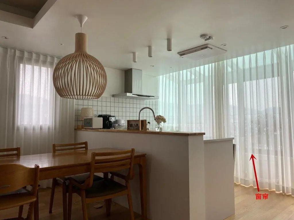 一张4人餐桌紧靠厨房摆放,小户型都可以借鉴一下这个设计,能提高家里空间利用率,且动线短,互动性比较强,真的是既温馨又宽敞。
