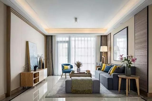 客厅的沙发背景墙处做了对称的木饰面板造型,中间留空的地方刷上暖色调的墙漆和摆放一幅挂画。顶部的跌级吊顶加藏光的设计,让客厅看起来更加大气。