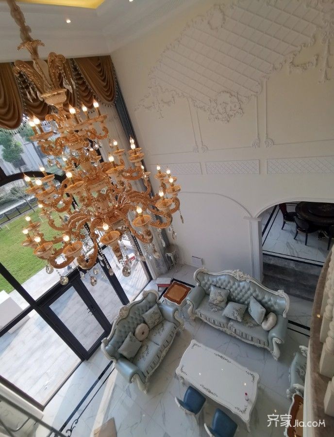 空间上用法式线条来突显空间感,在光影的剔透中,加上家具描金 金属饰品的营造,客厅呈现出简洁、对称和恢弘感;优雅高贵的蓝色画做了贯穿色,连接各个空间,并柔和了硬朗的空间氛围;天花吊顶饰浪漫的石膏浮雕,从顶倾泻下的通透感,沿环法式线条落于典雅的沙发之上;繁复的浅绿色印花,与悬挂的西方情调的油画,演绎优美的视觉感受;对称摆放着台灯、花束的边柜,家具的描金与地板上拼花粉饰出柔美清淡的锦簇奢华;