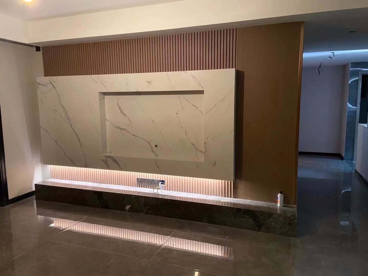 电视背景墙内嵌电视,实木格栅板与大理石结合,搭配灯带点缀